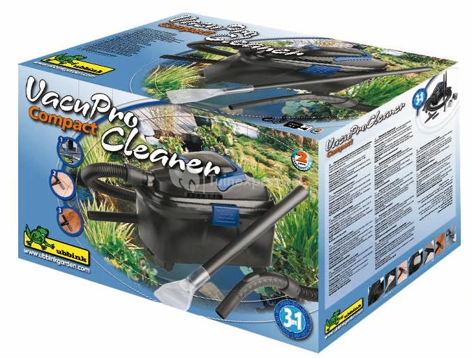 De VacuProCleaner Compact is een multifunctionele zuiger met vele verschillende toepassingsmogelijkheden en uitgebreide accessoires. De zuiger is gemakkelijk in gebruik en levert dankzij zijn stevige zuigkracht perfecte prestaties op. Met een vermogen van 1000 Watt verwijdert de VacuProCleaner op een comfortabele en eenvoudige manier algen, slib, verwelkte bladeren en ander afval uit het water. Naast het schoonmaken van uw tuinvijver of bassin kunt u ook nat reinigen of droog vuil opzuigen op stenen vloeren en vloerkleden. Afhankelijk van de toepassing kunt u kiezen tussen een handmatige of automatische bediening. Bij de automatische bediening wordt na 12 seconden het vervuild water automatisch afgevoerd waarna de reinigingscyclus weer na 30 seconden wordt herstart. De tank heeft een capaciteit van 10 liter en is voorzien van een filterblok voor het filteren van het afval. De VacuProCleaner is dankzij de wieltjes onder de compacte container makkelijk te verplaatsen en beschikt door een 4 meter lange zuigslang over heel veel bewegingsruimte.