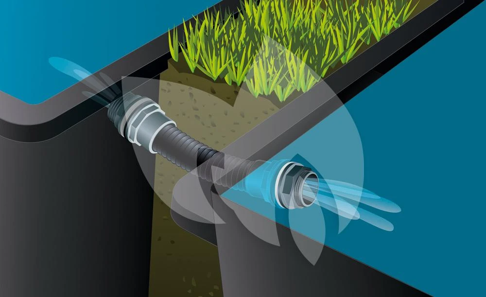 Gebruik het vijver verbindingsset om vijvers op een veilige manier te verbinden. Boor een gat van 60mm in een vlak gedeelte van de vijver om de doorvoer waterdicht te kunnen plaatsen.