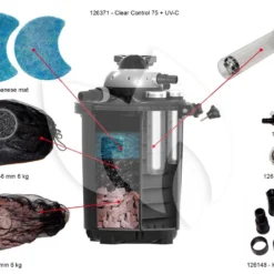 Deze zeer complete biologische drukfilter filtert het water weer kristalhelder en kan het water wel opvoeren tot een hoogte van 4 meter. Aangezien het filter bestand is tegen hoge druk is hij ook uitermate geschikt om te gebruiken voor een waterval. Doordat het drukfilter is voorzien van een UV-C lamp worden groene zweefalgen en andere ziektekiemen door de UV-straling gedood. Als één UV-C lamp onvoldoende is voor de doding van zweefalgen dan heeft u altijd de mogelijkheid om een tweede UV-C lamp te installeren in het filter. Het drukfilter heeft 7 verschillende standen en zijn doormiddel van de gemakkelijk te bedienen 7-standenkraan eenvoudig in te stellen. De 7 standen zijn als volgt: filterspoelstand, leegloopstand, filtratiestand, blokstand, medicijnenstand en winterstand. De standen worden uitgebreid toegelicht in de bijgevoegde gebruiksaanwijzing. De Clear Control is gemakkelijk aan te sluiten en er zijn drie typen drukfilters beschikbaar.